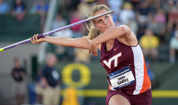Late-round heroics wasn’t limited to just the shot put and long jump on Thursday, as collegiate leader Irena Sediva of Virginia Tech claimed the javelin title in the very last round on the second-to-last overall throw with a career-best 192-9 (58.76m) heave.