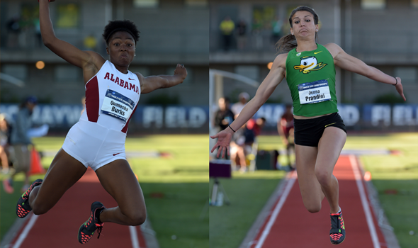 While the pole vault was flying historically high, the women’s long jump was soaring nearly as historically far horizontally. In a battle for the ages, collegiate leader Quanesha Burks of Alabama took down two-time NCAA long jump champ Jenna Prandini with a huge leap of 22-8w (6.91m, +2.6m/s) in the fifth round. The Duck superstar had been leading the competition with a career-best 22-3¾ (6.80m) leap in the third round before leaving to contest the 200.