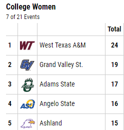 The rest of the men’s top-five is rounded out West Texas A&M (18 points), Lincoln (16), TAMU-Kingsville (16) and Grand Valley State (14).